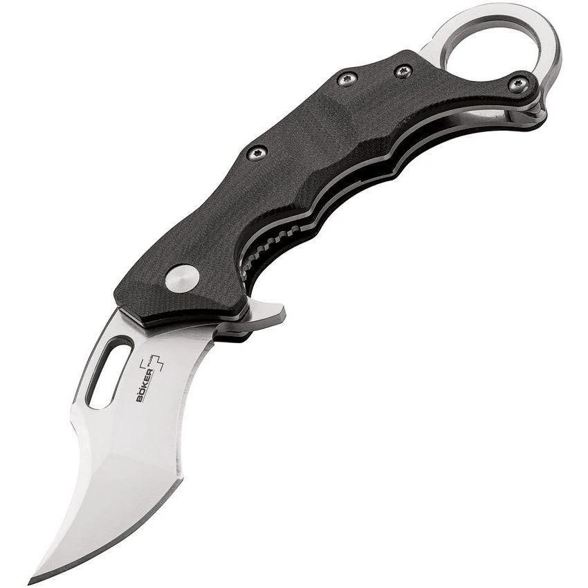 Model – BOP01BO772. Böker BKR01BO772 – Wildcat. 4.5″ closed. 2.88″ satin finish D2 tool steel karambit blade. Black G10 handle. Finger ring. Extended tang. Pocket clip. Thumb pull. Boxed. Made in China.
