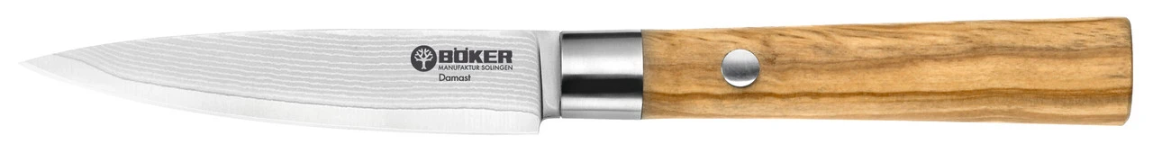 The story of success continues. The famous and very popular Damascus kitchen knives are now available with Mediterranean olive wood, which is hand selected to guarantee that only the best pieces of wood can be attached to these Damascus blades. The warm tone and lively feel of the wood makes food preparation all the more enjoyable. Outstanding edge retention and style at the same time! Blade length: 3 3/4″. Overall length: 8″. Weight: 1.7 oz.