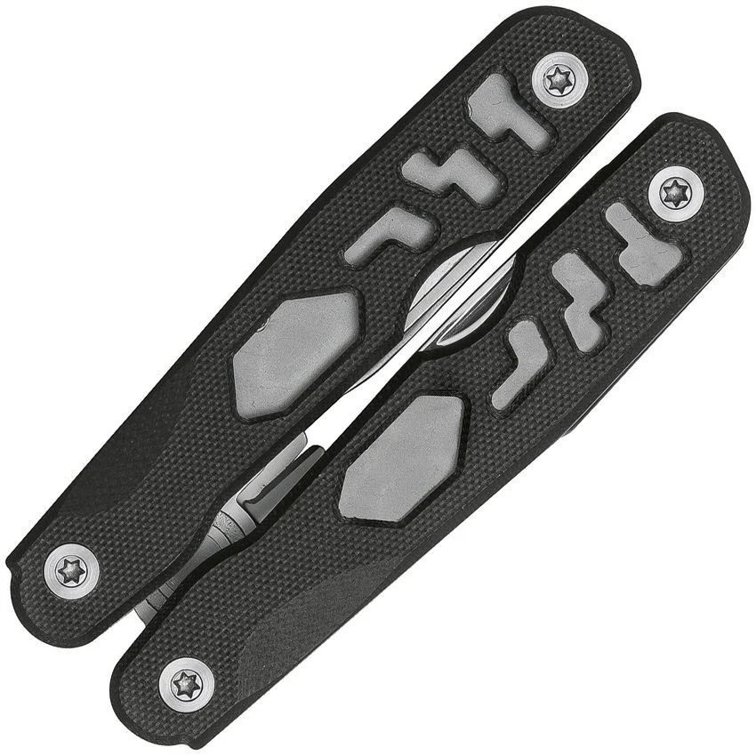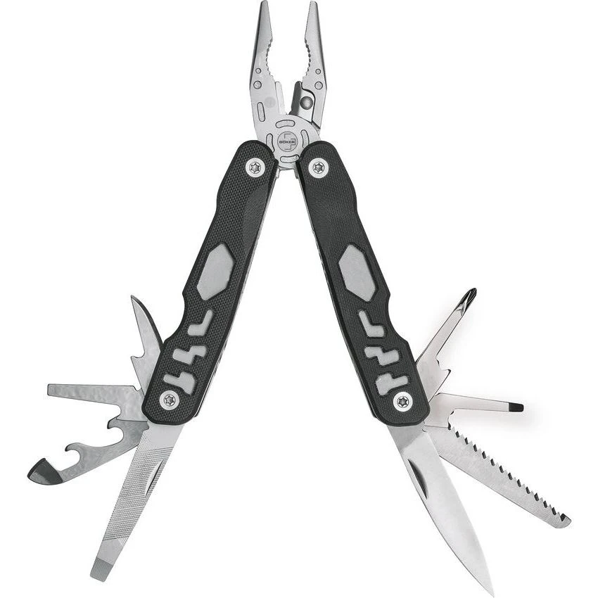 Model – BOP09BO800. Specialist I Multi Tool. 6.25 inch overall. Black G10 handles. Tools include: Pliers l Small blade l Saw blade l Phillips screwdriver l Bottle opener l Can opener l File l Wire stripper l Wire crimper l Reamer with sewing eye l Flat head screwdriver. Black nylon belt sheath. Boxed.