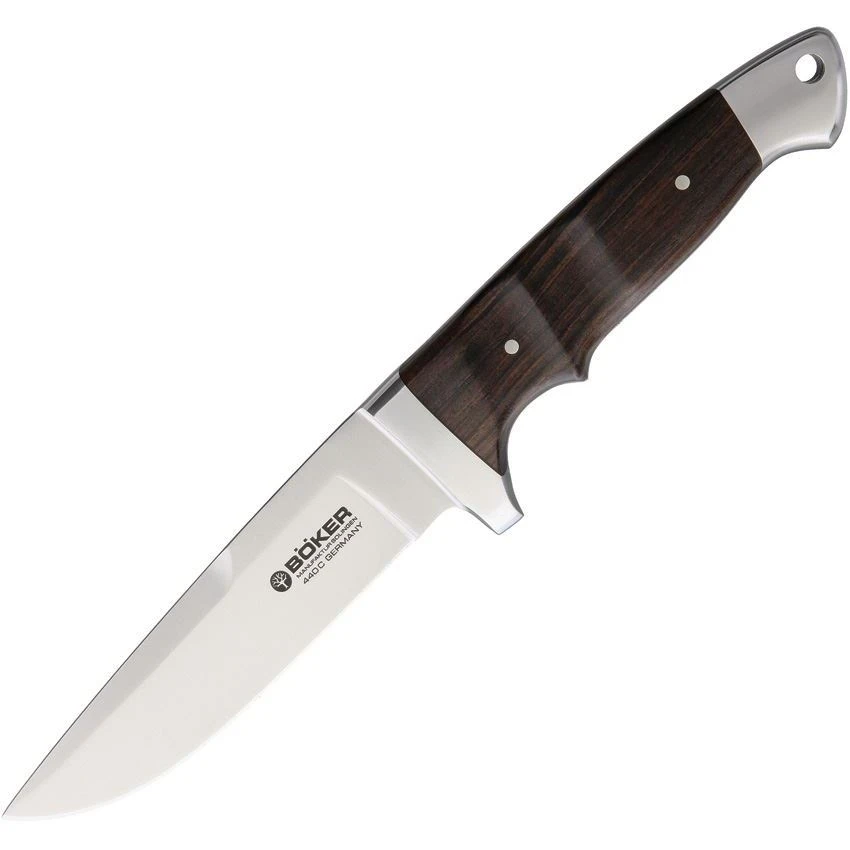 Model – BO121587. Integral Grenadill. 9.5 inch overall. 4.75 inch satin finish stainless blade. Grenadill wood handle. Stainless guard and pommel. Full tang. Lanyard hole. Brown leather belt sheath. Boxed.