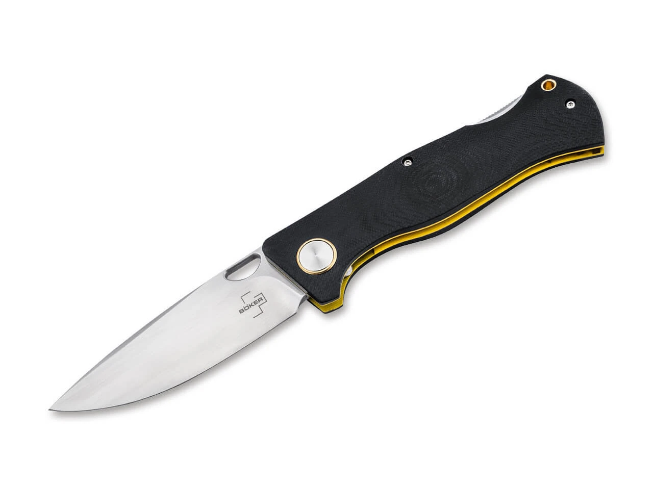 With the Boker Plus Epicenter Backlock, US designer Todd Rexford created a knife of awe-inspiring proportions that combines the irrepressible forces of nature and triggers an uncontrollable tremor in the reward centre of enthusiastic knife lovers. The droppoint blade made of D2 opens smoothly via thumb hole and has a fine hairline finish. This means that all cutting tasks are confidently razed to the ground by the knife. Thanks to the colour combination of yellow liners and black scales of the contoured handle made entirely of G10, the Epicenter ranks right at the top of the Richter scale. Only the robust backlock can tame the elemental force of the pocket-knife by securely locking the blade. The brass lanyard hole and ring on the blade axle screw increase the fascination of this natural phenomenon and inevitably make for shaky hands. For discreet carrying, the Epicenter is equipped with a deep-carry clip (r). Delivered with a high-quality nylon pouch.