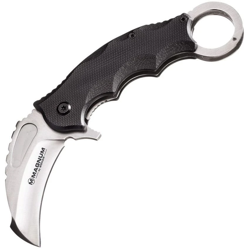 Model – BOM01RY115. Boker Magnum 01RY115 – Alpha Kilo Assisted Opening. Assisted opening. 4″ (10.16cm) closed. 2.75″ (6.99cm) satin finish 440A stainless karambit blade. Black G10 handle. Finger ring. Extended tang. Pocket clip. Boxed. Made in China.
