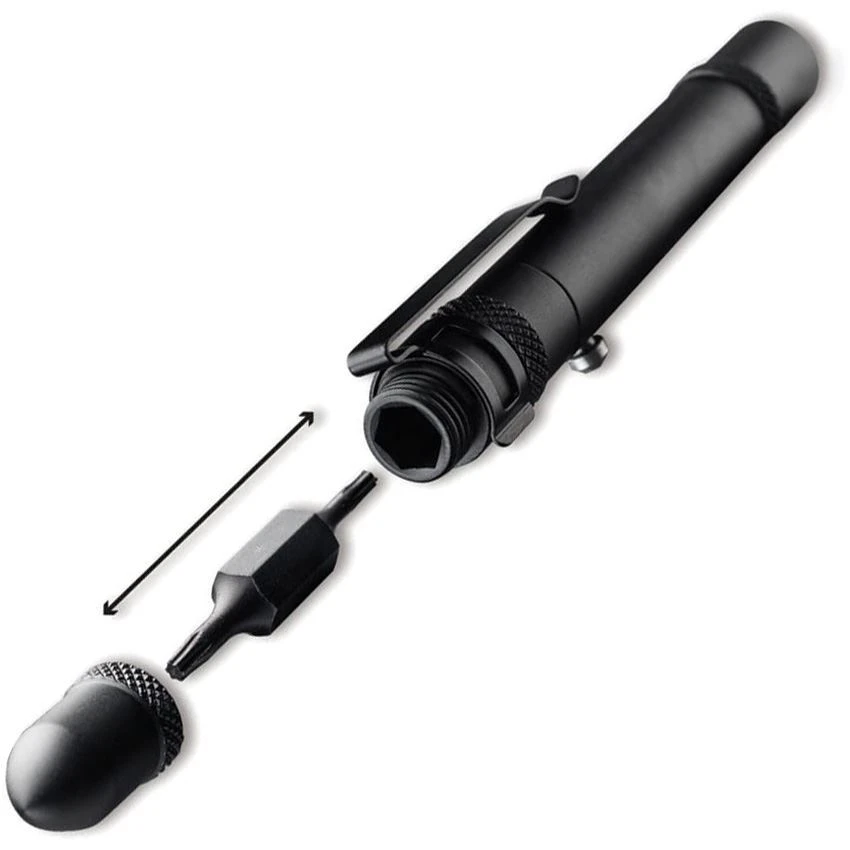 Model – BOP01BO128. Bit-Pen. 4.5 inch overall. Pocket clip. Lamy refill M-22. Handle holds double-sided Torx bit (T6 and T8). Practical bayonet mechanism. Aluminum construction. Color: Black. Boxed.