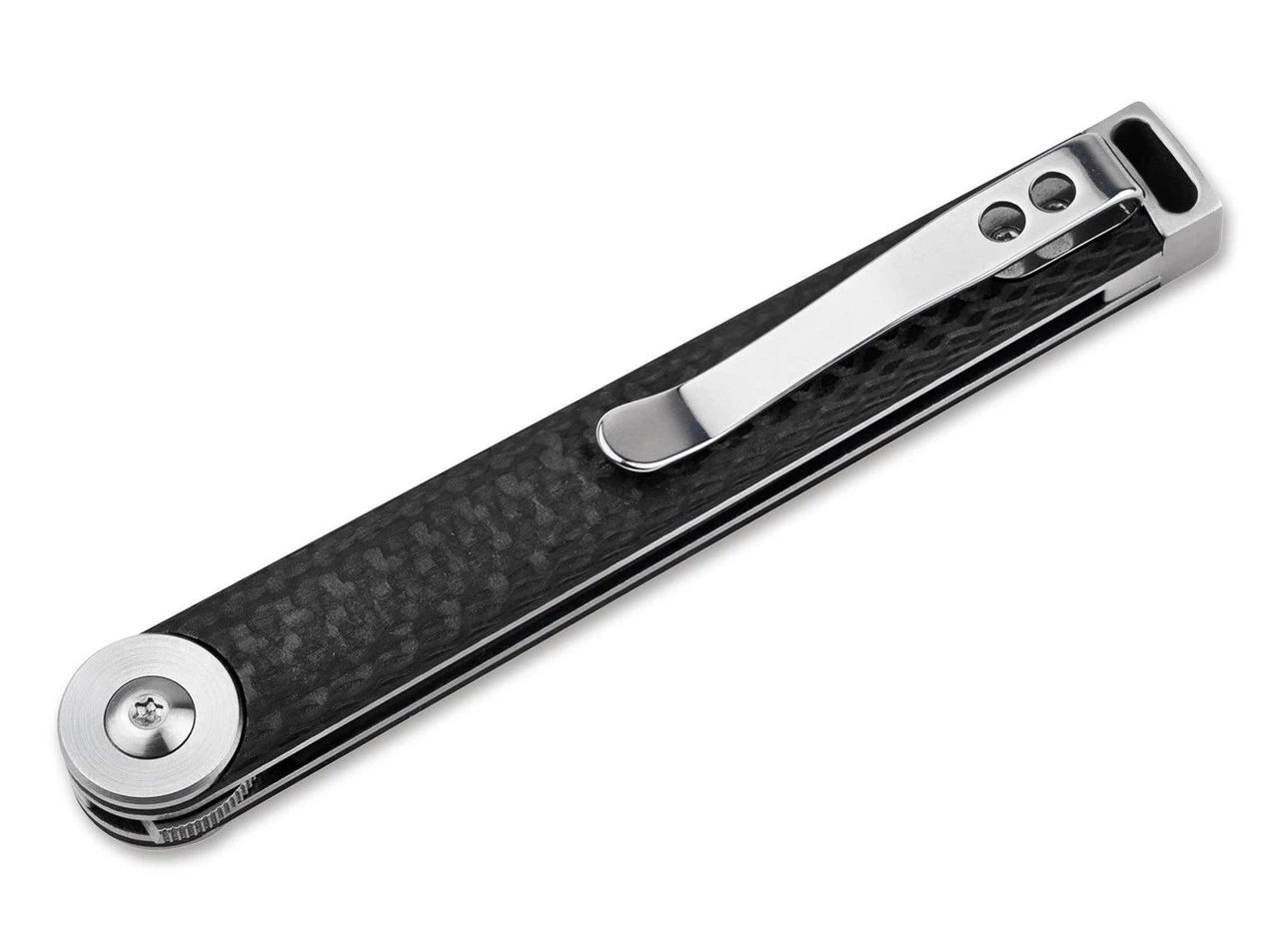 The ball-bearing blade made of satin-finished CPM-S- 35VN works its way through everyday cutting tasks with stoic calm and always finds its way back to its center with the help of the reliable liner lock. The decorative blade axle screw is the visual starting center of the Gentleman Folder as a symbol of change in form and function and leads into the straight-line catch strap eyelet at the end of the handle. The stylish handle made of modern carbon fiber lies comfortably in the hand and is equipped with a practical clip (tip-up/r). With high-quality nylon case for storage.