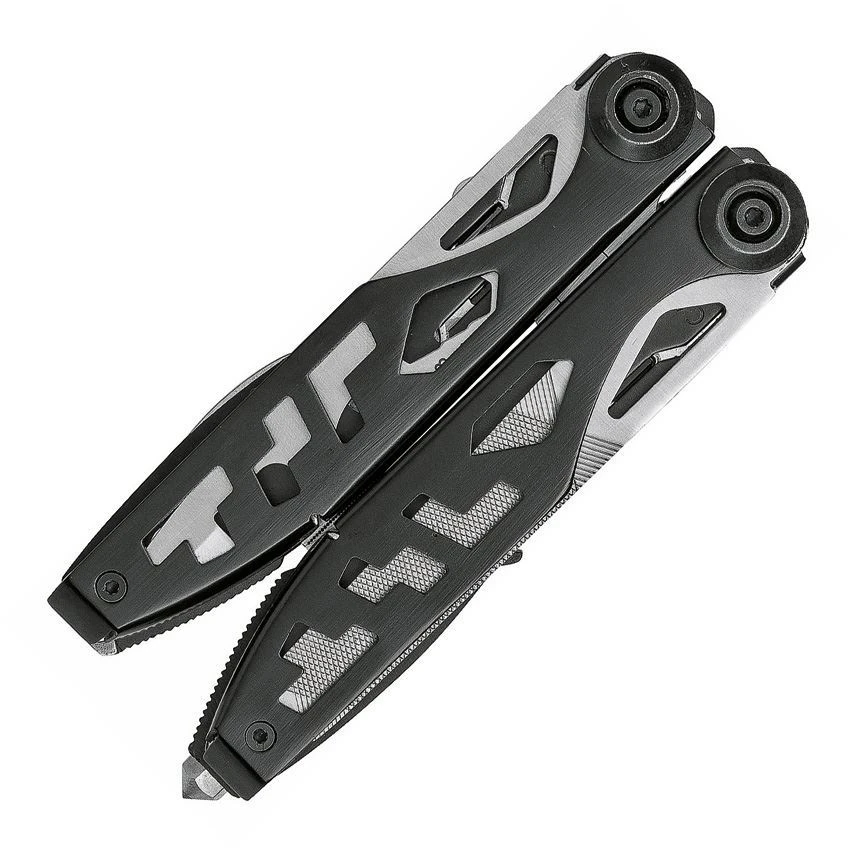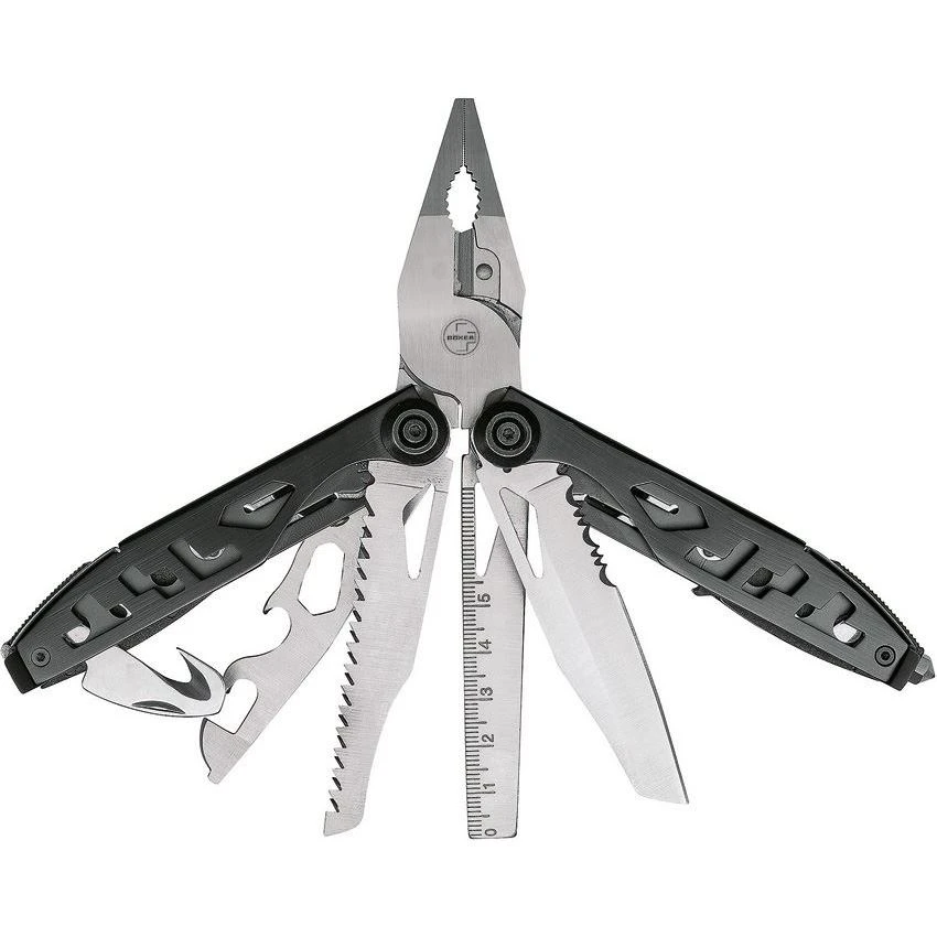 Model – BOP09BO810. Specialist II Multi Tool. 6.75 inch overall. Black stainless handles. Tools include: Needlenose pliers l Wire cutter l Locking components l Large blade l Saw blade l File l Ruler l Can opener l Bottle opener l Wire stripper l Belt/cord cutter l Glass breaker l Hex/Bit driver. Burner hole for gripping external hex screws, cap nuts and pipes I Allen key. Black nylon belt sheath. Boxed.